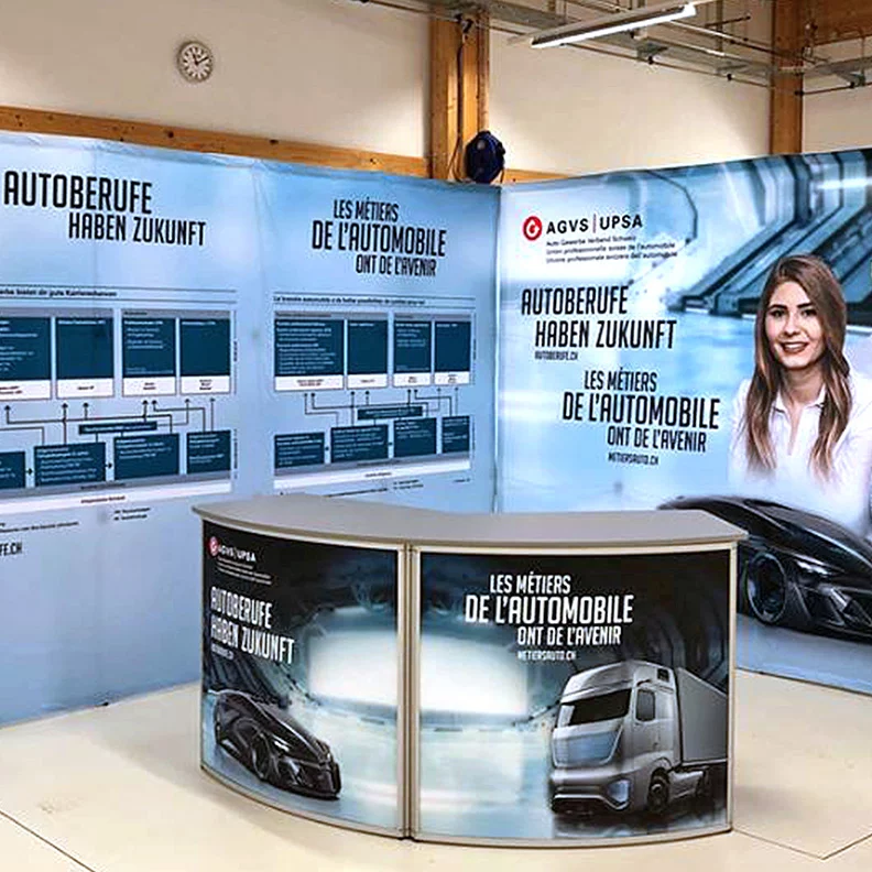 Pour que votre section ou votre garage attire immédiatement l’attention de chaque visiteur lors du prochain salon régional ou professionnel et laisse une impression positive et surtout durable, l’UPSA propose également des supports déroulants (Roll-up), des drapeaux (Beach Flags) et des parois d’exposition appropriés.